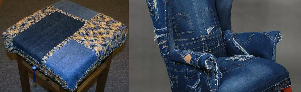 Например, из старых джинсов можно сшить чехол на резинке для кухонных табуреток без спинки. Он будет немарким и удобным для сидения. Чтобы он стал еще более оригинальным, используйте стиль пэчворк – шитье из лоскутков