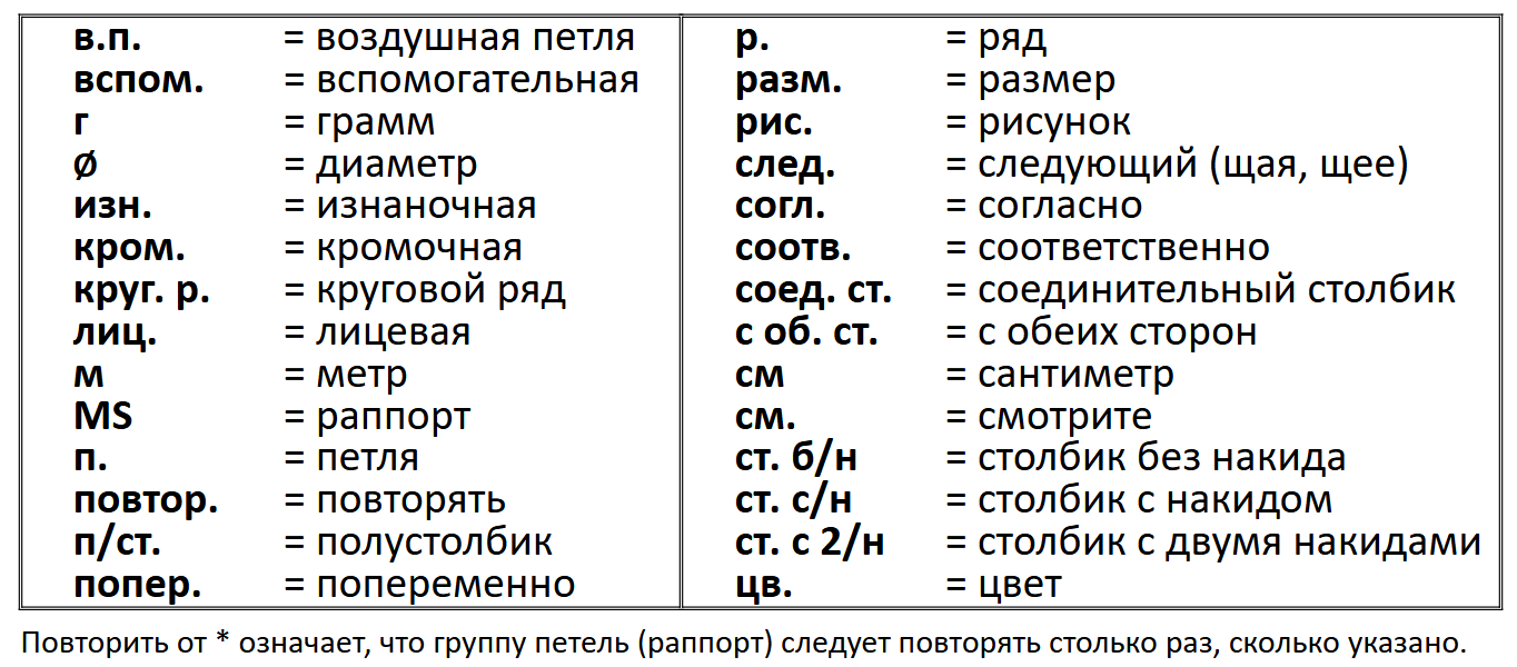 убав. = невидимая убавка (ввести крючок за переднюю стенку следующих двух петель, накид, вытянуть нить через первые две петли, накид, провязать обе петли на крючке)