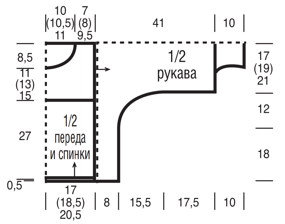 Для этого через 11 см = 44 р. (13 см = 52 р.) 15 см = 60 р. от смены узора закрыть средние 20 (22) 24 п. и обе стороны закончить раздельно. Для скругления по внутреннему краю в каждом 2-м р. закрыть 1 х 3 п., 2 х 2 п. и 5 х 1 п. Оставшиеся по 15 (18) 21 п. плеч закрыть на высоте средней части спинки.