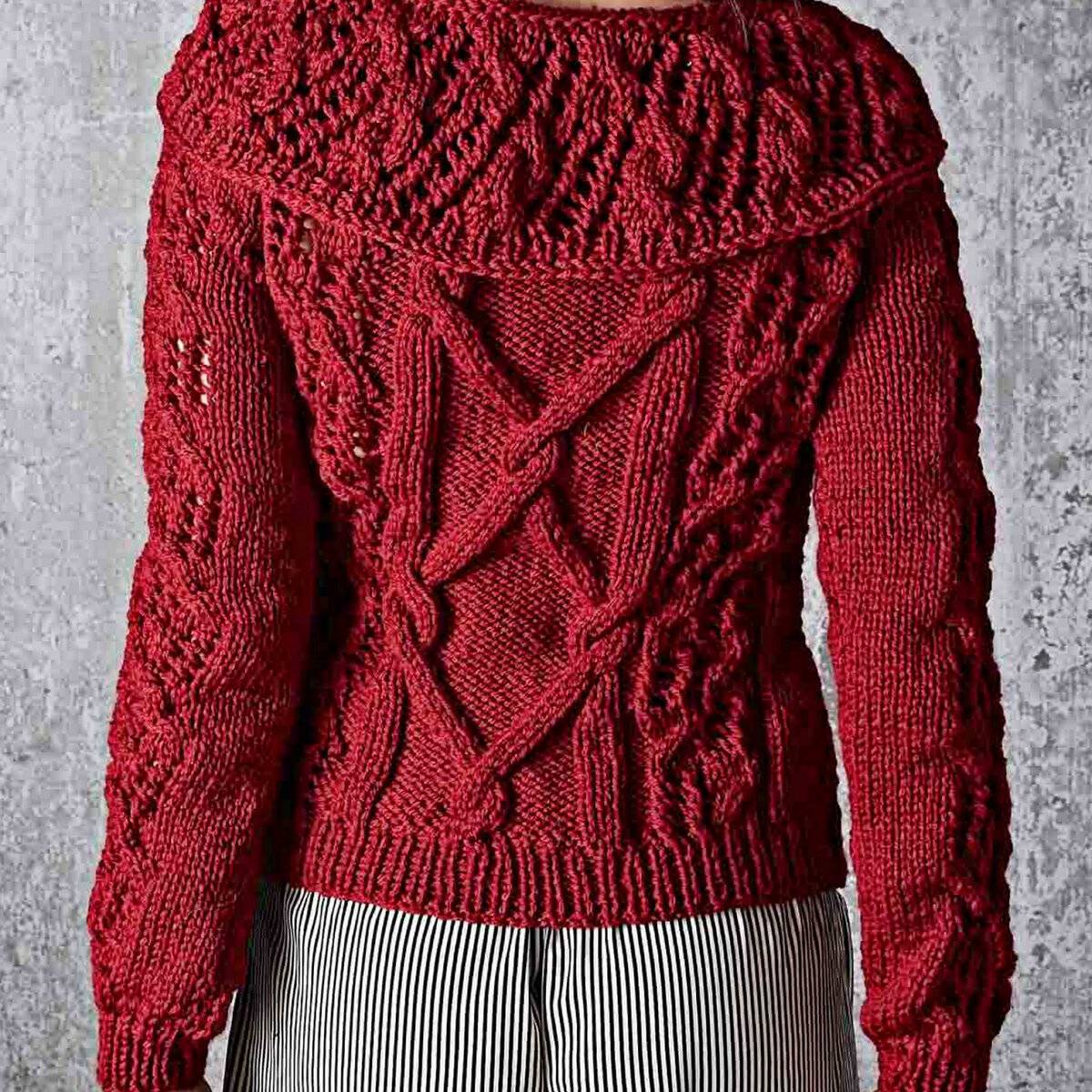 Вам потребуется: 18/19/21/23 мотка красной Pompadour 1149 пряжи Bouton D’Or Cocoon (60% альпака, 40% шерсти, 75 м/ 50 г); спицы № 4,5; 1 дополнительная спица.