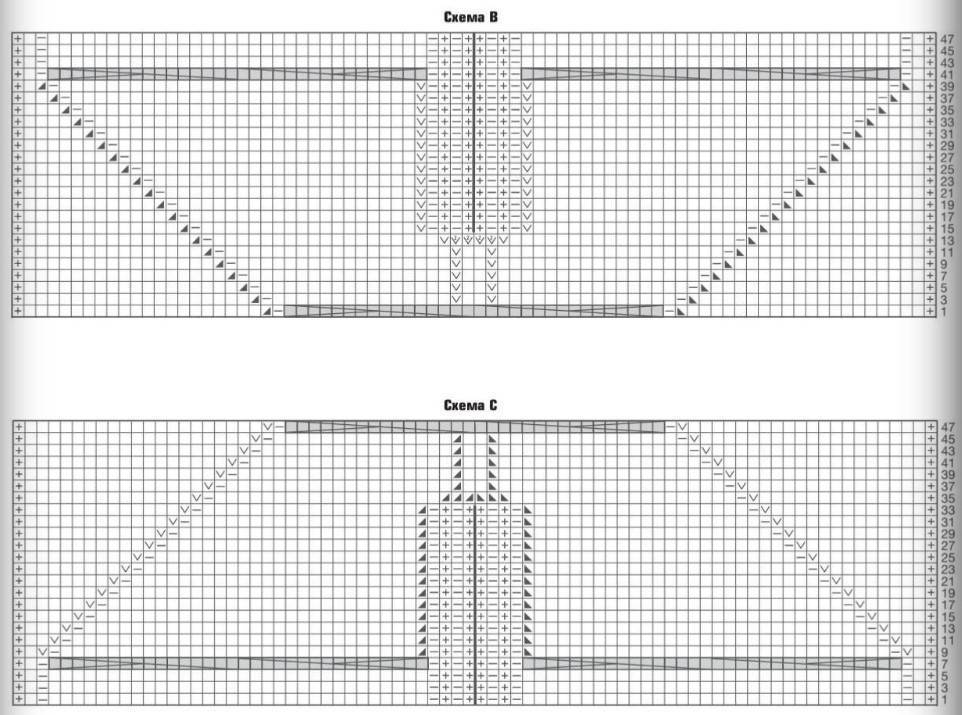 Узор с косами: вязать по соответствующей схеме, на которой приведены лиц. и изн. р. Лиц. р. читать справа налево, в изн. р. вязать петли по рисунку. Повторять по схемам А, В и С в высоту с 1-го по 24-й р.