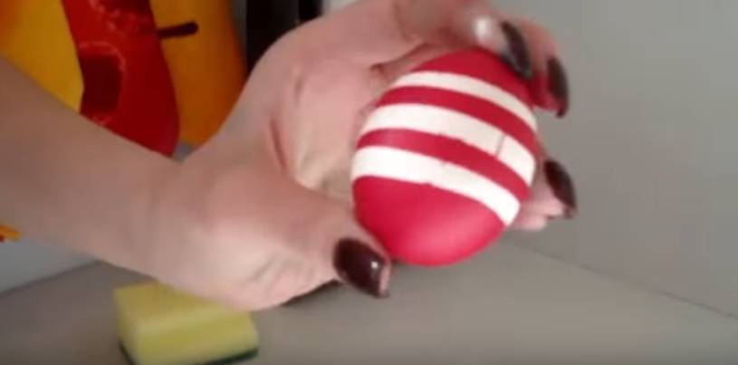 Ещё один легкий способ это сделать оригинальные линии на яйце. Для этого на понадобиться обыкновенная изолента. Нарезаем её на тонкие полоски и поэтапно плотно наклеиваем вкруговую эти полоски.