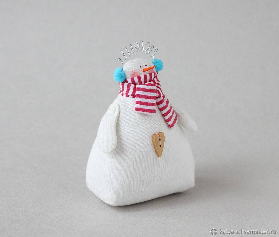 Cделан из четырёх пенопластовых шариков. Каждый шарик обмотан шпагатом и покрашен белой гуашью. Глазки – полубусины. Шапочка и шарфик связаны на спицах.