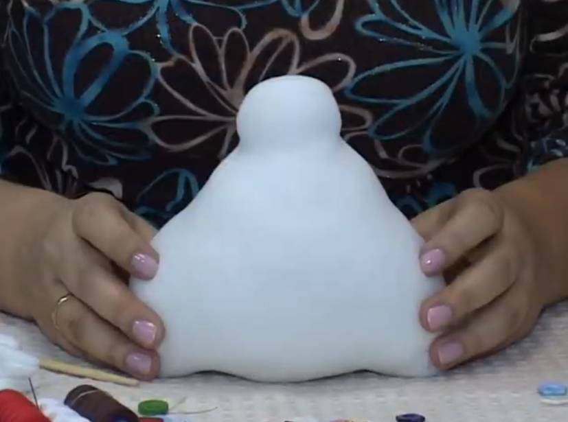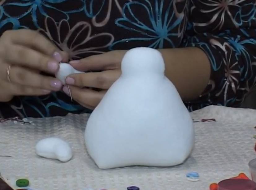 Приклеить заготовку на картонную подставку (ножки). Маленькие веточки или вырезанные из картона «ручки» пристроить к корпусу с помощью ваты. Вылепить нос-морковку из массы, разукрасить и прикрепить к игрушке. Нарисовать глаза и рот. На шею повязать яркий шарфик.