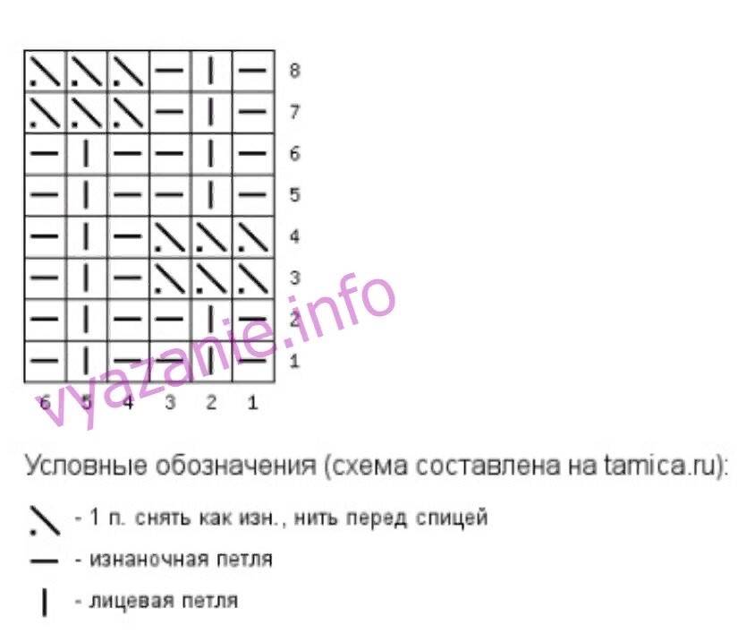 Подготовительный ряд: *1 лиц.; 8 изн.;* 1 лиц. – для поворотных рядов. *1 изн.; 8 лиц.* — для вязания по кругу.