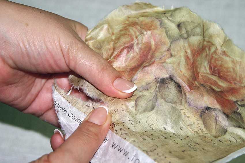 На фото бумаги для декупажа, хорошо заметна разница между вырезанным и вырванным фрагментом на готовом изделии.