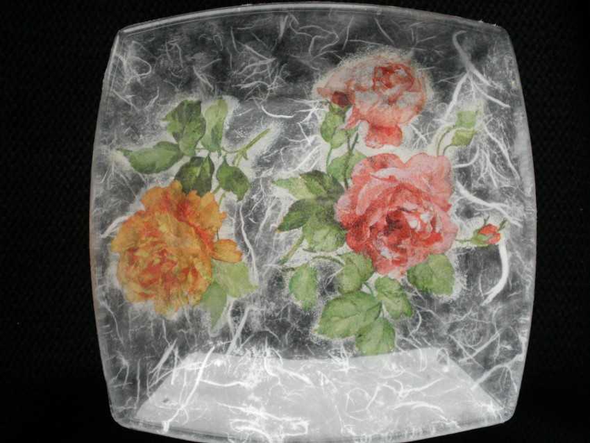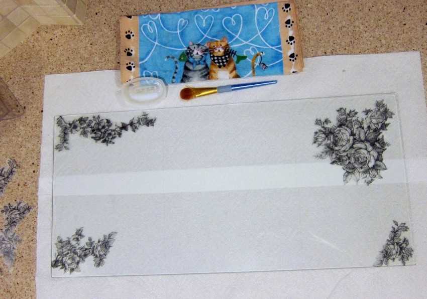 Обратный декупаж на стекле применяют для декорирования кухонных принадлежностей, которые не нуждаются в тщательной шлифовке. Все действия выполняются в обратной последовательности. Это позволяет скрыть не только границы изображения, но и большинство дефектов. Обратный декупаж состоит из таких этапов: