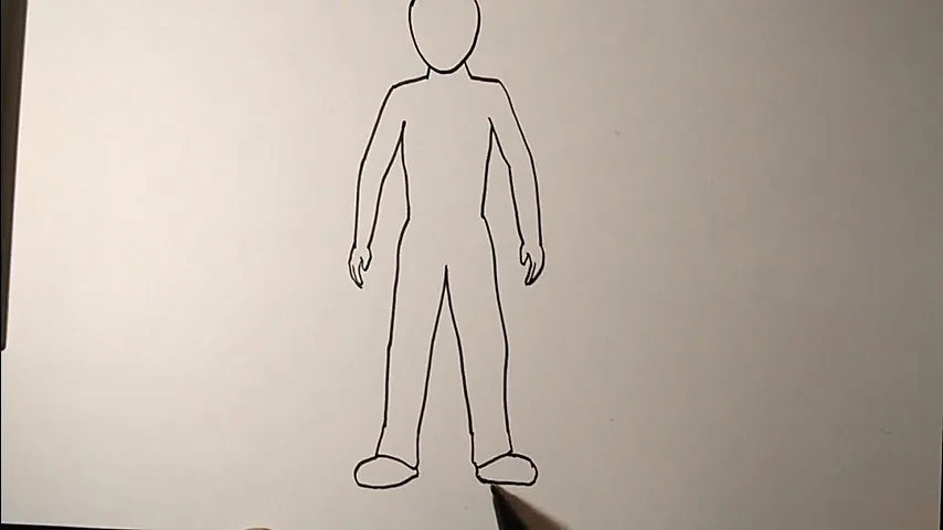 - Начертите ноги: проведите линии отнизу туловища вниз до земли. Нарисуйте круги в области коленей и небольшие овалы в области голеней, чтобы показать их объем.