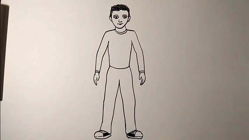 - Нарисуйте тело мальчика: соедините плечи с верхней частью сиденья, чтобы образовать форму туловища, затем нарисуйте руки, которые опираются на лавочку.