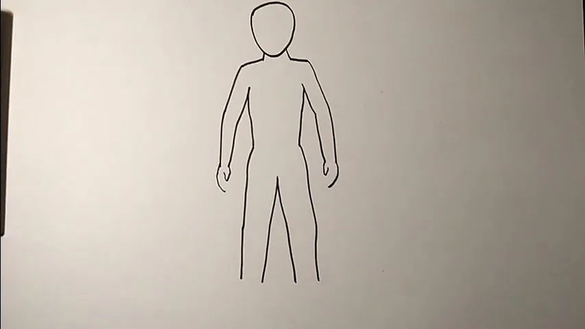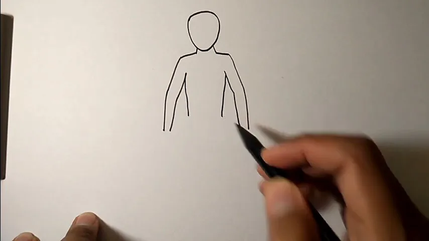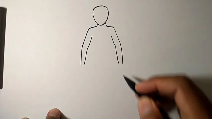- Нарисуйте туловище: соедините верхнюю и нижнюю горизонтальные линии, чтобы получилась форма туловища. Нарисуйте также плечи и руки, проведя линии от каждого плеча вниз.