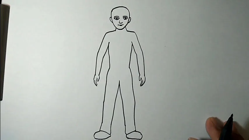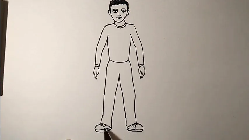- Проводится стрелка от локтей до таза. Это очень удобно для тех, кто рисует впервые. Руки молодого человека будут в карманах, пальцы можно не рисовать.