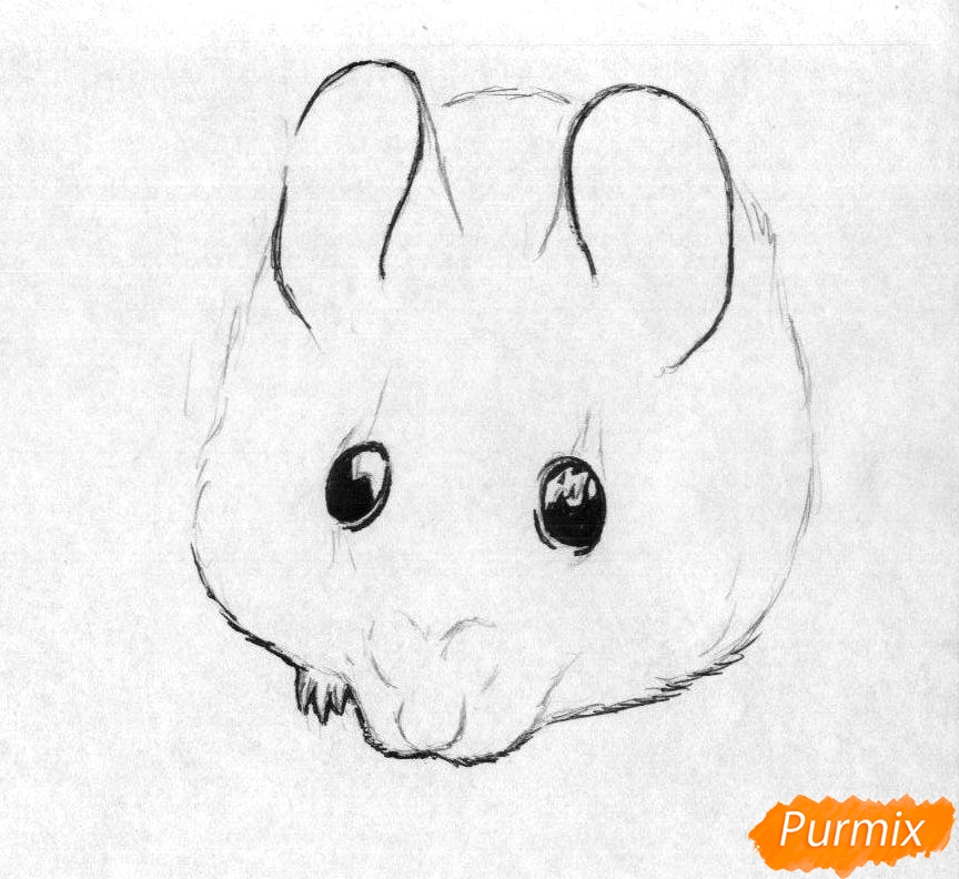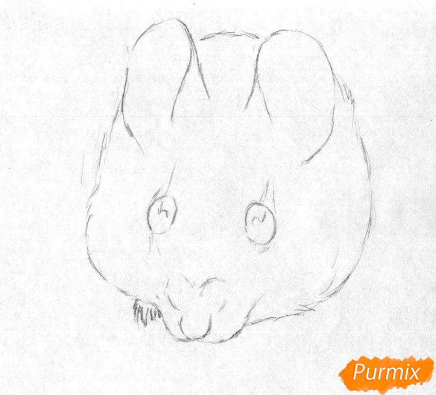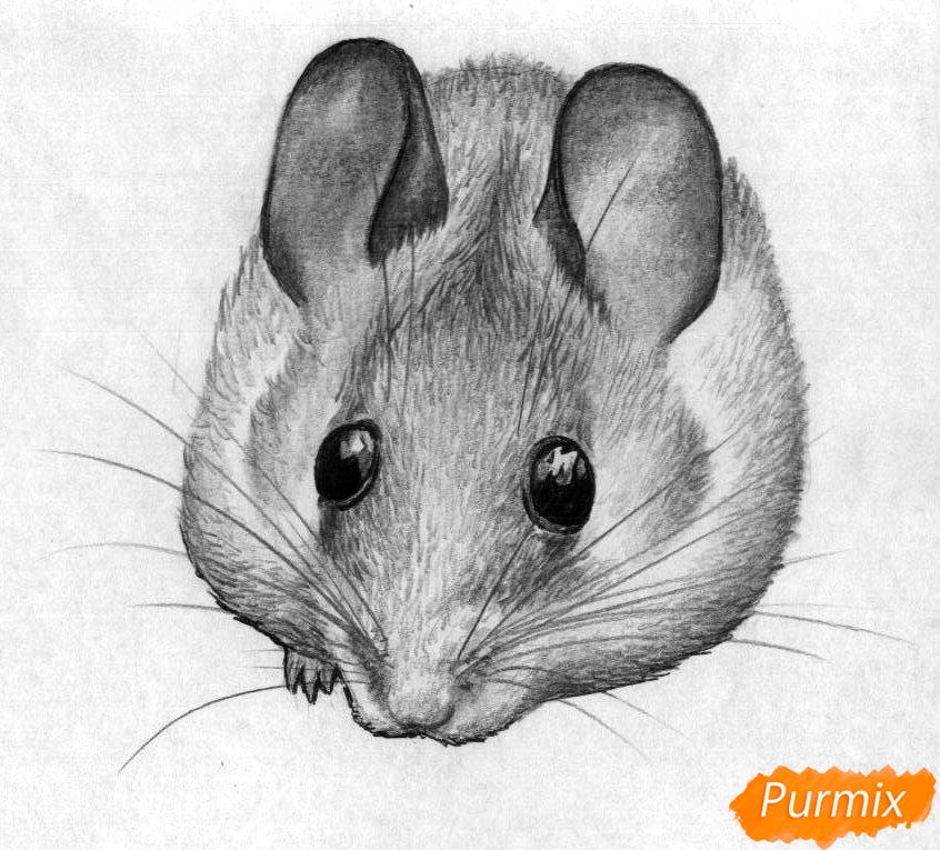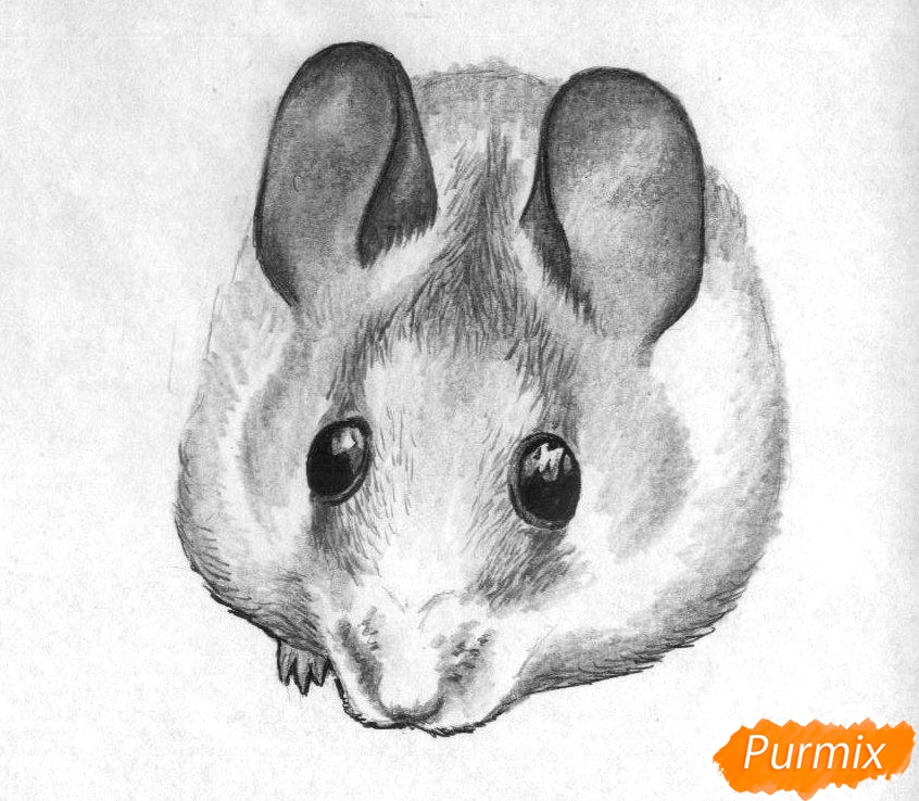 Мягким карандашом затемняем зрачки, как показано на рисунке. После этого заштриховываем мышь и растушёвываем кусочком бумаги. Далее затемняем уши и прорисовываем шерсть на лбу короткими штрихами по направлению от носа к макушке.