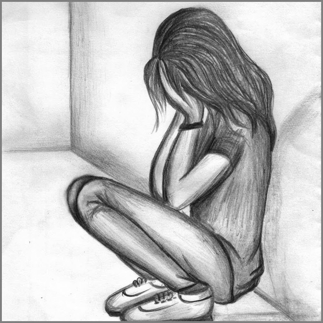 Грустная картинка для срисовки. Девушка на корточках сидит, закрыла лицо руками, расстроена очень. Грустные рисунки для срисовки часто спрашивают!