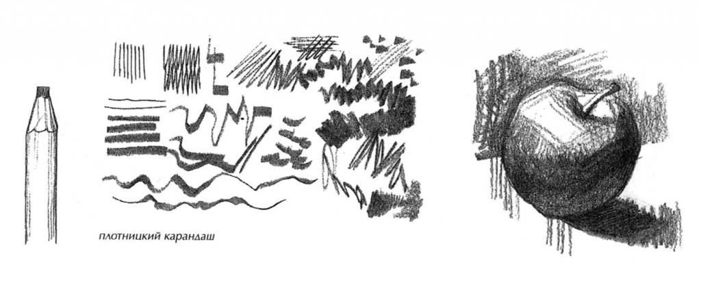 - Плотницкий карандаш. Это широкий плоский карандаш в деревянной прямоугольной оболочке. Он был создан для столярных работ, но полюбился и многим художникам, поскольку позволяет наносить тон широкими мазками, а также дает хорошую вариативность линии.
