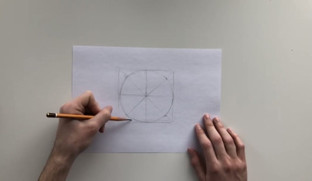 Чтобы в последствии получить нарисованный шар 3d, берем карандаш HB и намечаем ровный квадрат. Далее делим квадрат по горизонтали и по вертикали. Потом мы делим его по диагонали, и отрезки – сверху, снизу, сбоку, должны соответствовать отрезку по диагонали, чтобы размеры все были одинаковые. Затем, далее, эти отрезки мы соединяем и получаем ровный круг.