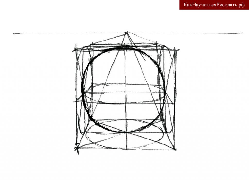 В учебных целях на всех сторонах куба делаем следующий рисунок. Соединяем диагоналями углы стороны куба. Пересечение диагоналей указывает на центры сторон куба. Через эти центры на всех сторонах куба проводим центральные вертикальные и горизонтальные линии, соединяющие противолежащие грани сторон куба. Следующее действие требует понимания того как строится . На каждой из сторон куба рисуем эллипсы (круг, изображенный с учетом перспективных сокращений), которые являются проекциями будущего шара на поверхности куба. Еще один эллипс вписываем в центральный горизонтальный срез куба. Этот эллипс является центральным горизонтальным срезом шара.
