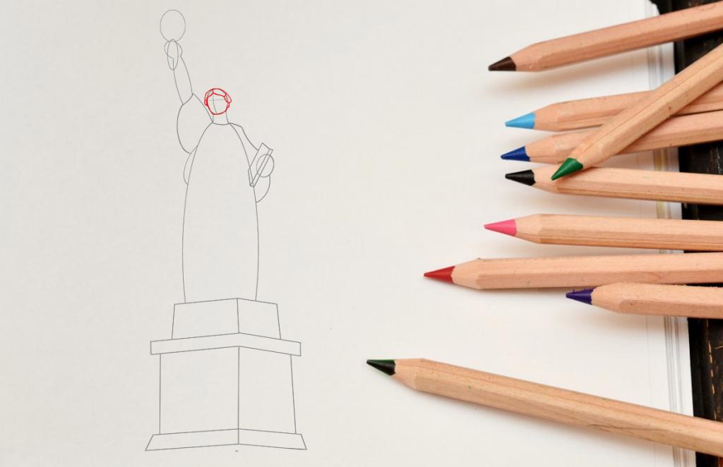 Используйте свой карандаш для добавления контуров вокруг головы Статуи Свободы и обратите внимание на детали волос и пучка венка