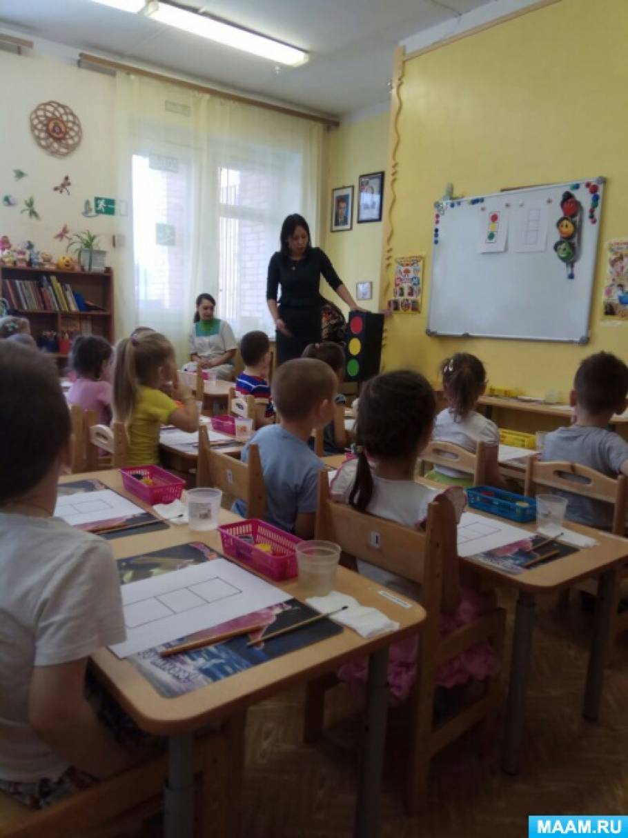 Перед началом выполнения работы стоит вспомнить об основных сигналах светофора. Также необходимо рассмотреть светофоры для машин (с тремя сигнальными огнями) и для пешеходов (с двумя огнями). Далее можно сказать детям, что светофор как бы разговаривает с машинами и людьми на своём языке, который все понимают. Можно сказать, что светофор тоже работает в дорожно-постовой службе.
