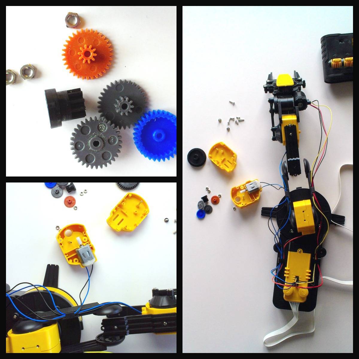 Аккуратно разобрав «локтевой сустав», удалось определить, что без нагрузки моторчик работает бесперебойно. Разошёлся корпус, внутрь выпал один из шурупов (потому что его примагнитил моторчик), и если бы мы продолжили эксплуатацию, то шестерёнки были бы повреждены — в разобранном виде на них была обнаружена характерная «пудра» из стёршейся пластмассы.