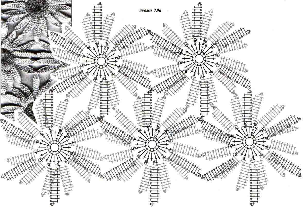Ромашковый плед и скатерть можно связать по одной и той же схеме мотива, состоящего всего из трех рядов.
