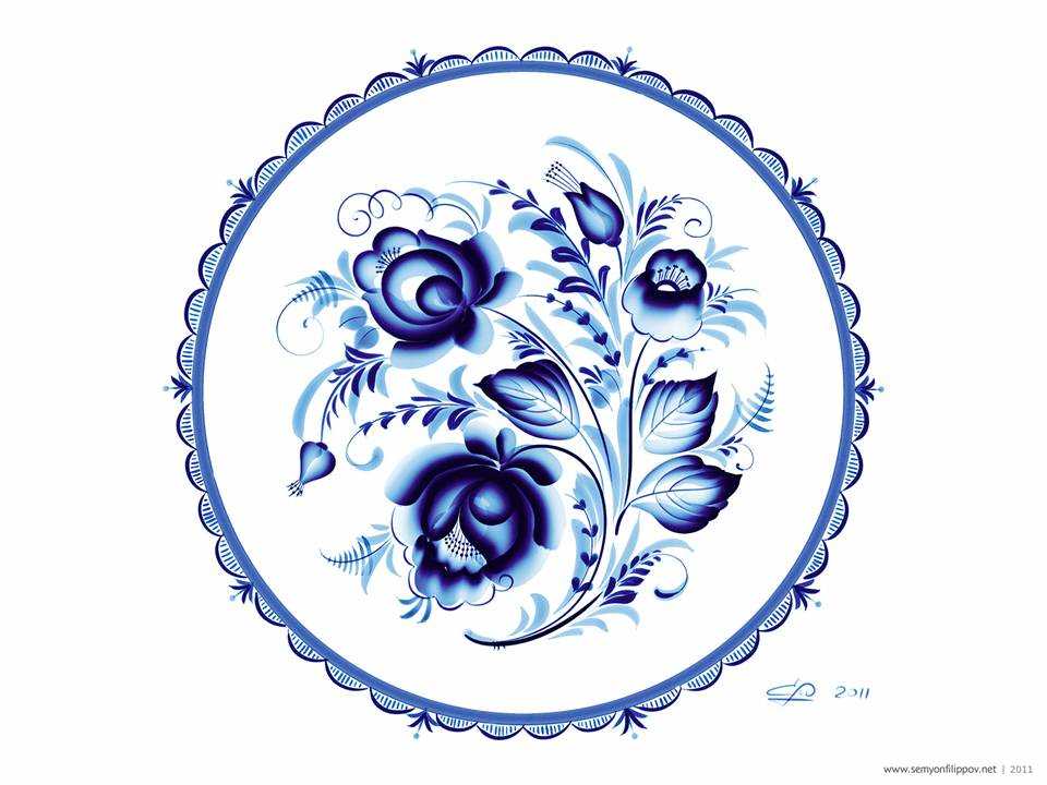 Не стоит забывать и про народное мастерство – гжель, которая очень хорошо смотрится на керамических тарелочках. Чтобы сделать такую роспись, достаточно перевести через копирку понравившийся узор (наметить линии) или перерисовать его от руки.