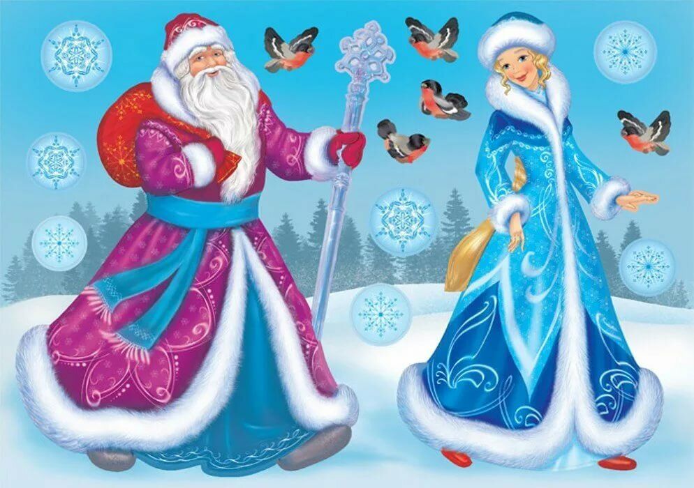 Срисовку Деда Мороза и Снегурочки допускается использовать в качестве вытынанок на окна и шторы. В первом варианте — шаблоны клеятся на стекло на клеевую основу в виде мыльного раствора или сахарной воды. Второй — представляет собой крепление на скотч.