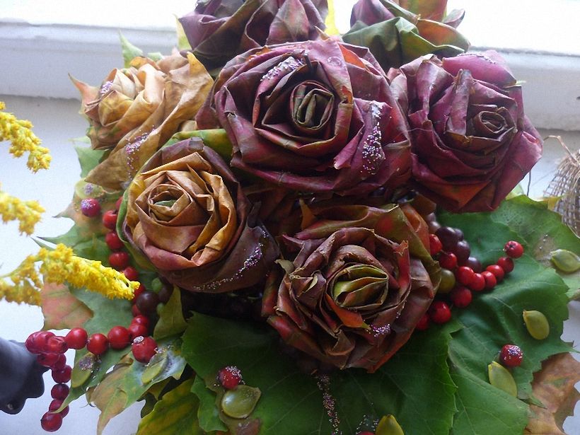 Розы и бутоны можно делать разной формы и размера, оборачивая листья плотно или более рыхло. Сделав несколько цветов и бутонов, собираем их в букет. Между розами помещаем листья различных деревьев, сухоцветы, плоды клена или другие природные материалы. Если предполагается, что стебли роз будут видны, их можно обернуть лентами, нитками или эластичной клейкой лентой зеленого цвета.