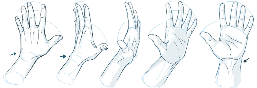 Если у вас проблемы именно с рисованием пальцев, то представьте их как череду цилиндров. Такая простейшая форма поможет вам нарисовать пальцы под любым углом. Взгляните на рисунок: края цилиндров становятся линиями сгиба, точками, где расположены суставы.