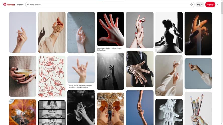One good way to get good hand reference photos on Pinterest is just by typing in “hand photos” or “hand photography” on the search bar.