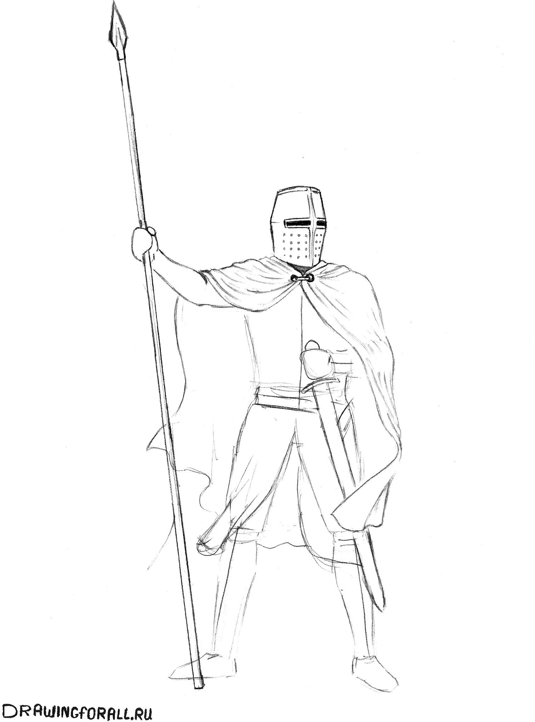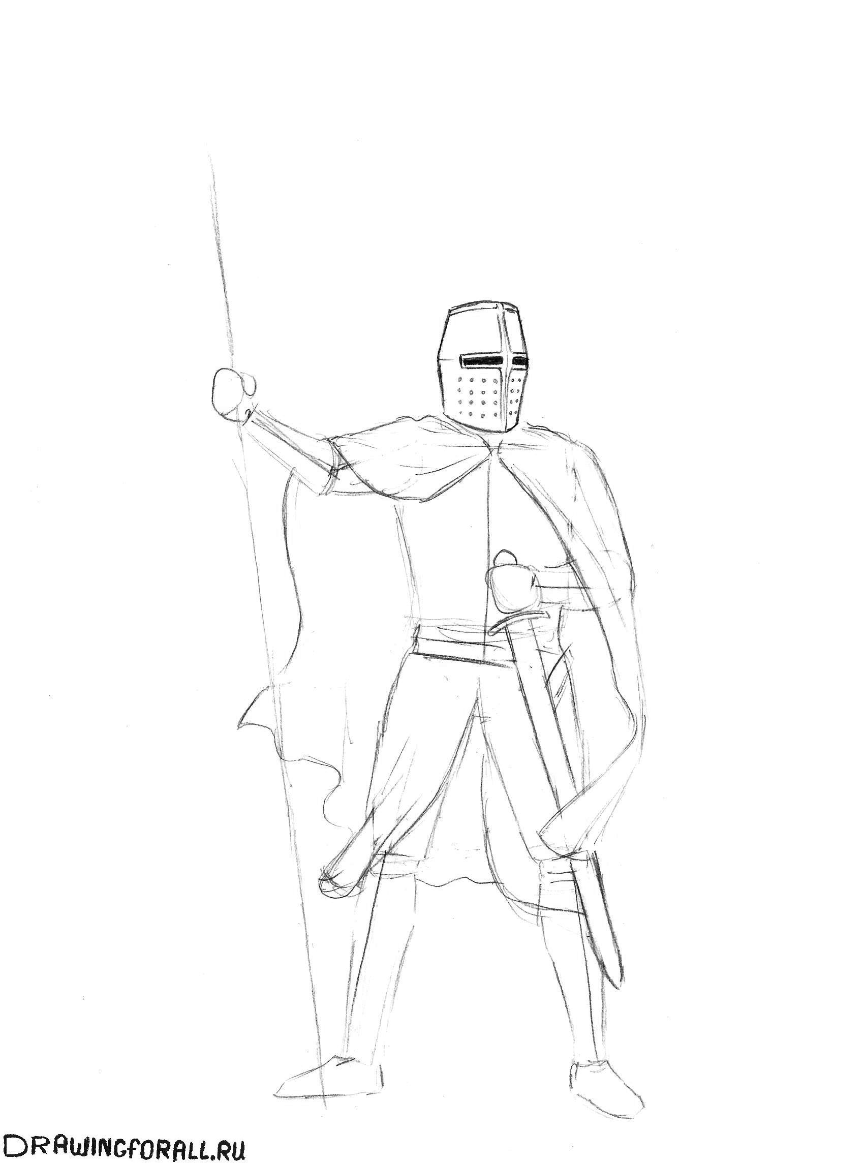 Рыцарь в доспехах (рисунок этого персонажа можно изобразить стоя со знаменем и в шлеме) выглядит более реалистично, если ему добавить плащ, который развевается на ветру.