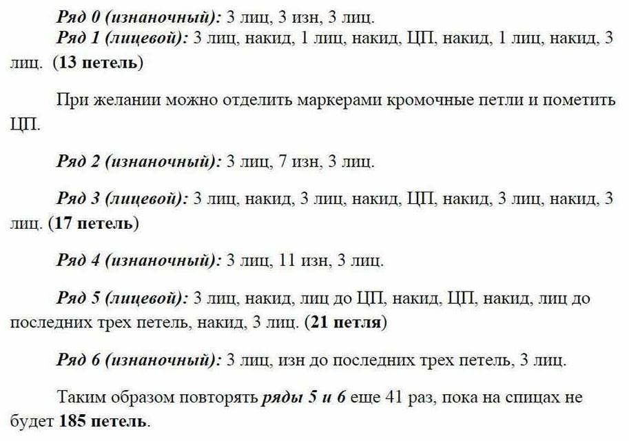 3 р: 1 лиц, накид прямой (петля накидывается движением «на себя»), 1 изн, накид на себя, над центральной первого ряда провязать лицевую, накид от себя, 1 изн, накид от себя, 1 лиц.