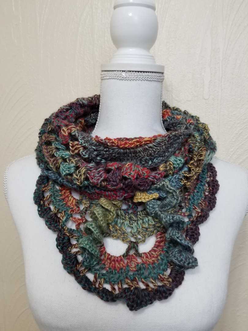 Боснийский бактус из секционной пряжи вяжется очень легко. Здесь нет сложных мотивов и огромных, малопонятных схем. Но изделие при этом выглядит совершенным. По такому принципу можно связать и детский шарф для девочки. Волнистый, необычный орнамент изделия подойдет абсолютно к любой одежде.