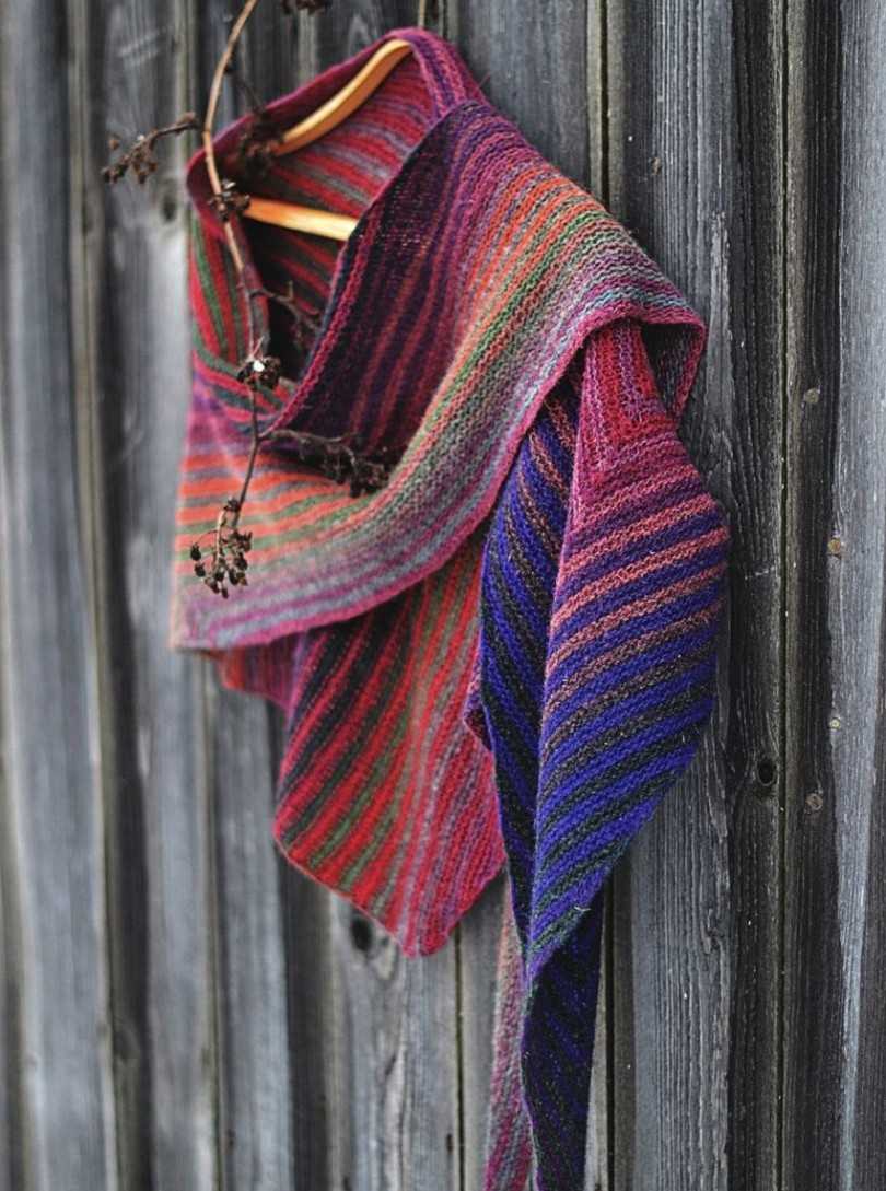 Материалы Пряжа Schachenmayr Merino Extrafine 285 Lace (100% шерсть, 50 г/285 м) по 2 мотка цветов 00583 и 00584; спицы круговые 3.75 мм длиной 100 см Плотность вязания 22 петли и 52 ряда = 10х10 см платочным узором