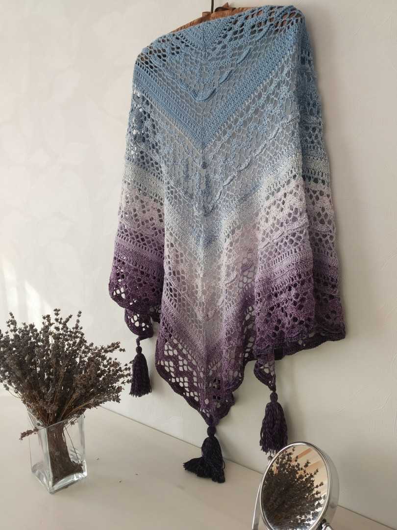 Чтобы создать такую шаль крючком схемы вовсе не понадобятся. Достаточно лишь изучить мастер-класс с детальными фото и придерживаться указанного в инструкции алгоритма.