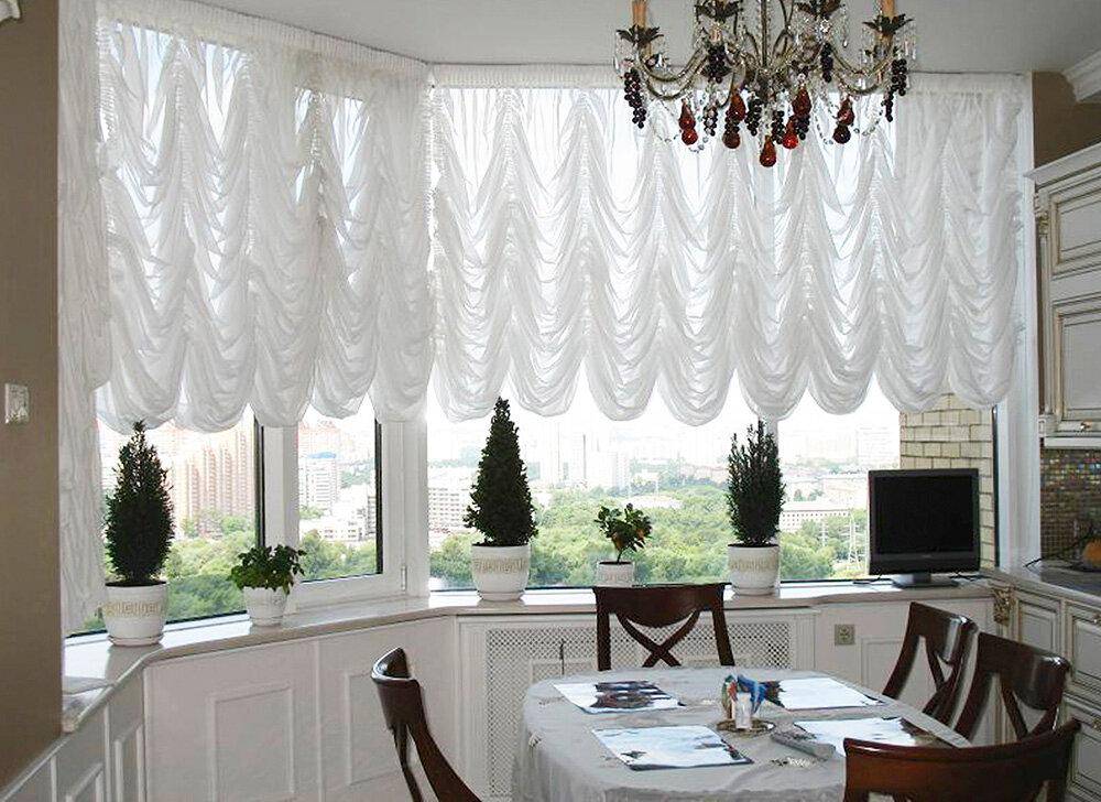 Большие эркерные окна являются популярным архитектурным решением. Для их оформления используют богатые и насыщенные по цвету фасоны. На эркерных окнах на кухне можно использовать штору-«маркизу» до подоконника в комбинации с римской.