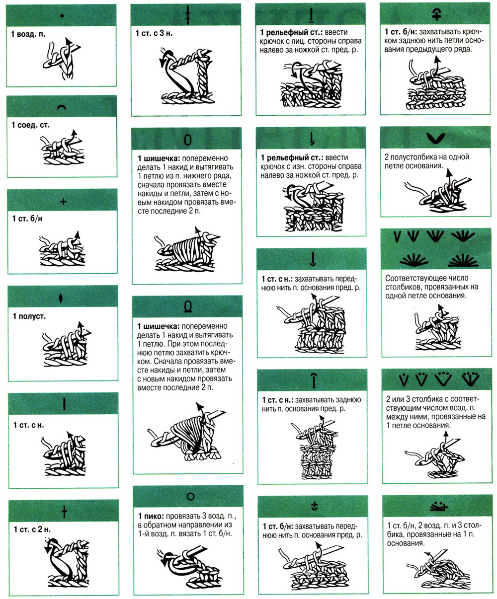 ВП – воздушная петля, СБН – столбик без накида, ССН – столбик с одним накидом, СС2Н – столбик с двумя накидами, СС – соединительный столбик.