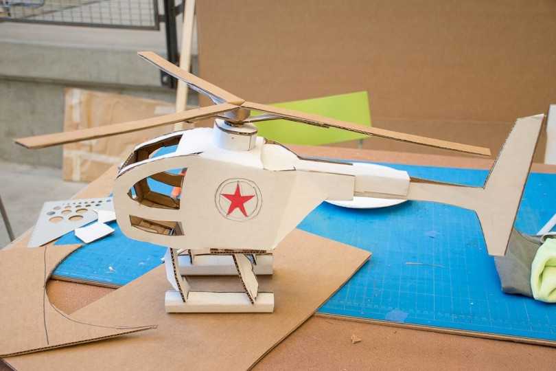 Эффектно смотрится поделка вертолет. Если в планах собрать целую коллекцию и расположить все единицы техники на миниатюрном аэродроме, такие схемы будут очень полезны. Объемные винты гармонично свисают над красивым корпусом, такое зрелище не оставит равнодушным любого ребенка.