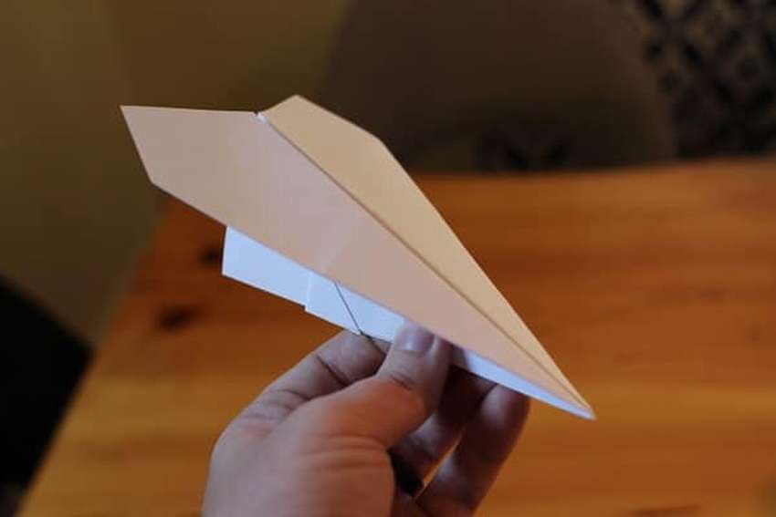 13. Сложите крылья так, чтобы их внешняя кромка соприкоснулась с нижней кромкой киля самолета. Жесткая и прочная конструкция готова!