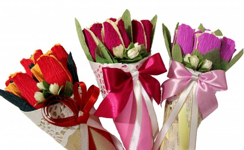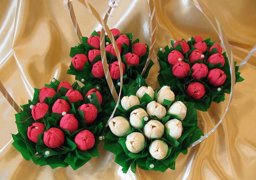 Дополнительно букет можно украсить бусинами и бантами из атласных лент. Цветы из конфет можно поместить в корзинку.