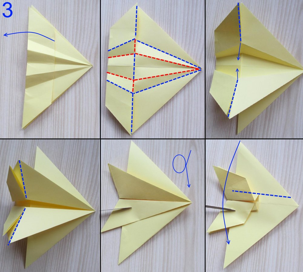 Бумагу формата А4 положи узкой стороной к себе и загни к середине верхние углы. «Домик» сложи пополам и разверни деталь сгибом вверх, а треугольную вершину заверни вовнутрь, чтобы получился своего рода клюв. Одновременно отогни в сторону край «клюва» и подними вверх крыло, чтобы получилась фигура как на схеме.