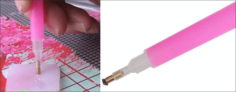 - Специальный стилус с полым окончанием, которым перемещают кристаллы на схему. Для этого в полую трубку помещают специальную силиконовую массу, которой захватывают камушек и выкладывают его на изображение. К некоторым стилусам прилагаются насадки на три, пять и больше стразов. С их помощью удобно выкладывать большие участки одного цвета.