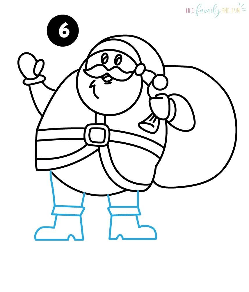К этому моменту ваш рисунок Санта-Клауса почти готов – разве что Санте нужны ноги, чтобы носить его по всему миру. Обязательно нарисуйте их внизу круга, добавив на концы сапоги, чтобы ногам Санты было тепло и приятно.