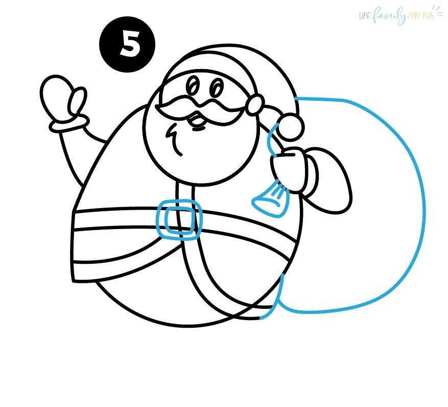 Прежде чем вы пойдете дальше, важно, чтобы ваш рисунок Санта-Клауса имел соответствующие аксессуары! Используйте квадрат в квадрате, чтобы сделать пряжку для ремня, где пересекаются все линии на теле Санты. Затем нарисуйте еще один полукруг, соединяющийся с телом Санты, для его мешка с игрушками!