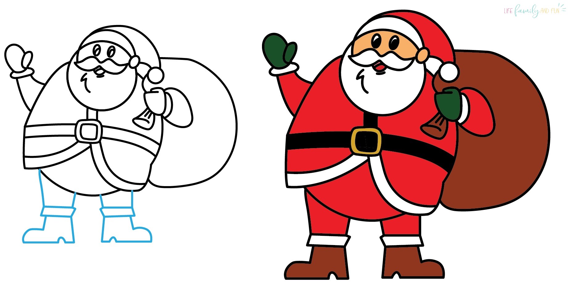 Your Santa outline is now complete. Color your cartoon of Santa Claus. Since the 1880s, he has been depicted with a white beard, rosy cheeks, and a red suit trimmed in white fur.