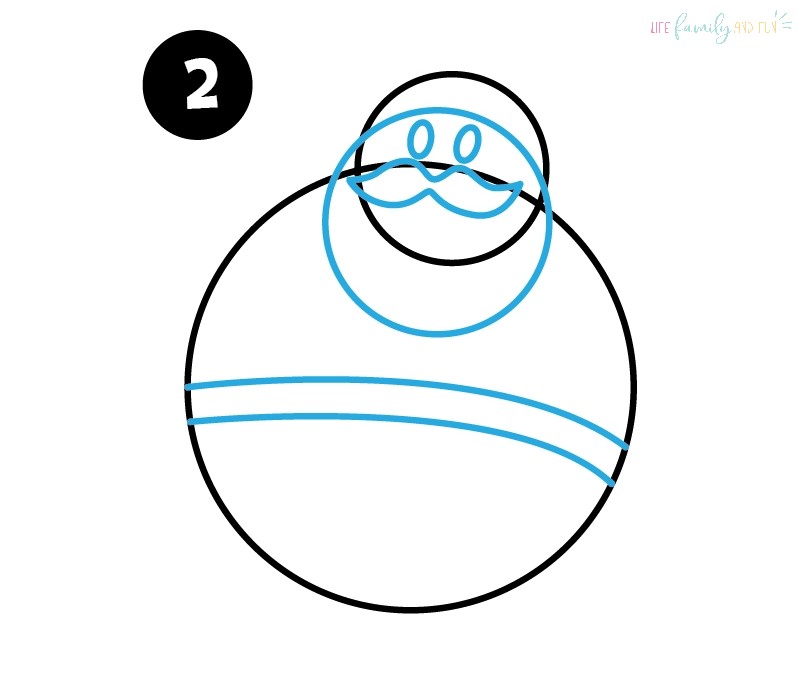 2. Draw a circle between the eyes to form the nose. Then, use curved lines that meet at points to enclose two teardrop shapes connected to it. This is Santa’s mustache. Use curved lines to enclose the mouth and tongue.