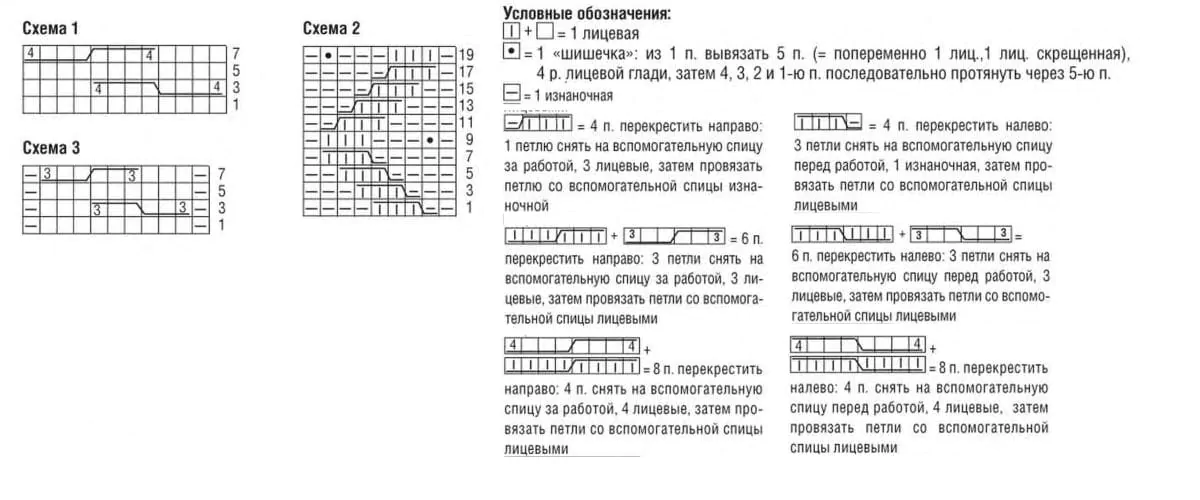 Перекрещивание (ПКР) вправо 2 лиц/2 лиц: 2 пет. снять на вспомогательную спицу и оставить за работой, вязать 2 лиц, затем 2 лиц. со вспомогательной спицы. Перекрещ. (ПКР) влево 2 лиц/2 лиц: 2 пет. снять на вспомогат. спицу и оставить перед работой, вязать 2 лиц, затем 2 лиц. со вспомогательной спицы. Перекрещ. (ПКР) вправо 2 лиц/2 изн: 2 лиц. снять на вспомогательную спицу и оставить за работой, 2 изн., затем 2 лиц. со вспомогат. спицы. Перекрещ. (ПКР) влево 2 изн/2 лиц: 2 пет. снять на вспомогат. спицу и оставить перед работой, 2 лиц., затем 2 изн. со вспомогат. спицы.