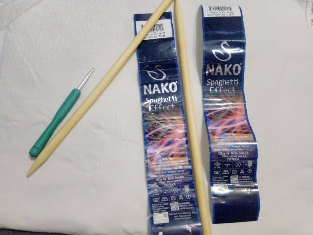 Изначально хотелось выбрать максимально толстую нить с достаточным содержанием шерсти. Поэтому я хотела Alizee Country. Но найти пряжу так быстро не удалось, и поэтому нашелся альтернативный вариант. Было решено вязать в два сложения с помощью нитей Nako Spaghetti Effect.