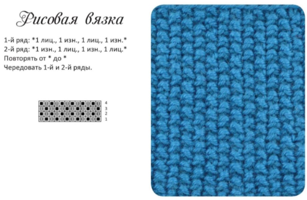 - Узор “Рис”: 1 лиц, 1 изн – чередуем. Следующий ряд – наоборот.