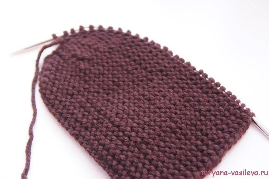 - Распределив петли на 4 спицы, вяжем по кругу, используя платочную вязку до закрытия мизинца.