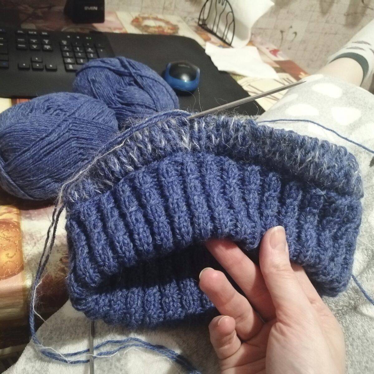Далее берём спицы № 3,5 и добавляем к 2 нитям синей пряжи одну белую нить кид мохера. Начинаем вязать английской резинкой, предварительно убавив количество петель до 90. Если вы не уменьшите количество почти вдвое, у вас получится очень большой берет, так как английская резинка существенно добавляет объёма. Я уменьшала следующим образом: провязывала 2 петли вместе лицевой, далее снимала следующую петлю вместе с накидом как изнаночную.